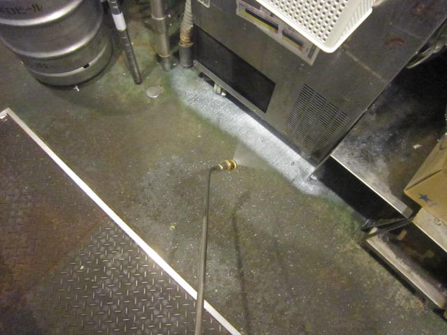 厨房内下回りへのスミチオン10%乳剤10倍液残留噴霧実施。排水溝(グレーチング)隙間等に潜んでいることも多いので、排水溝も入念に乳剤処理実施。